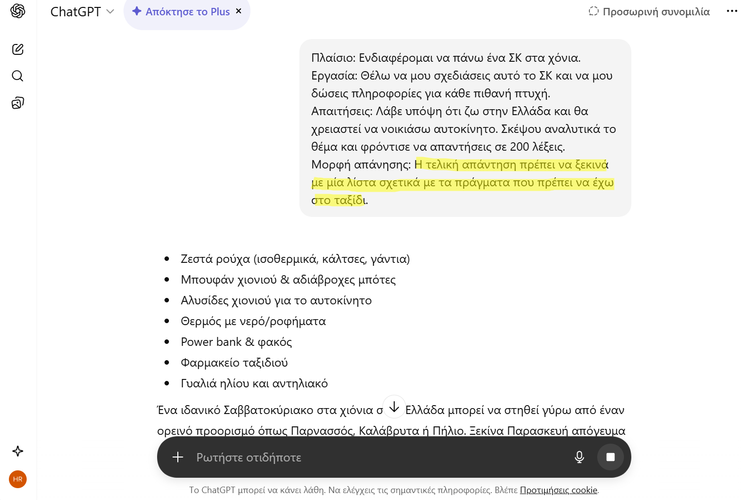 Επιπλέον, όταν δίνουμε στο ChatGPT σύνθετες προτροπές, φροντίζουμε να τις δομούμε χρησιμοποιώντας επικεφαλίδες όπως “Πλαίσιο:”, “Εργασία:” και “Απαιτήσεις:”, αντί να γράφουμε μία ενιαία παράγραφο.