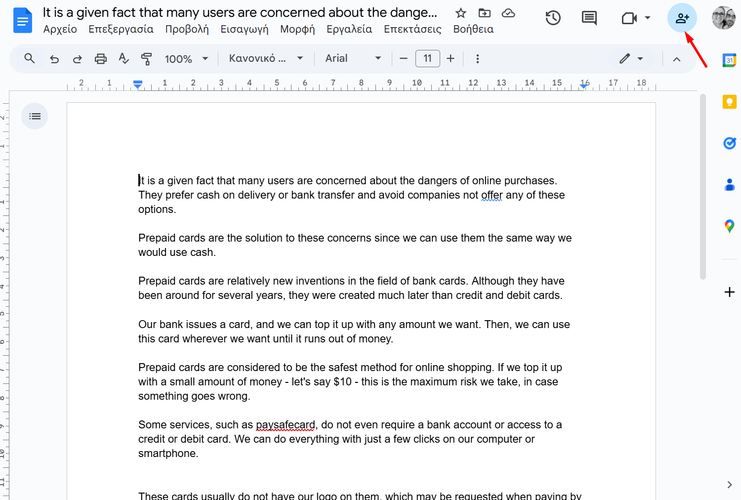 Αρχικά, ανοίγουμε το αρχείο που θέλουμε να μοιραστούμε και κάνουμε κλικ στο κουμπί της κοινοποίησης, πάνω δεξιά.