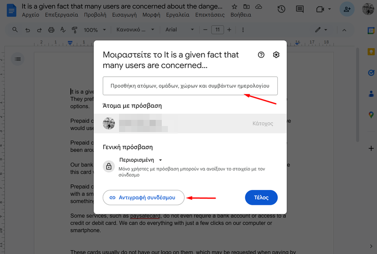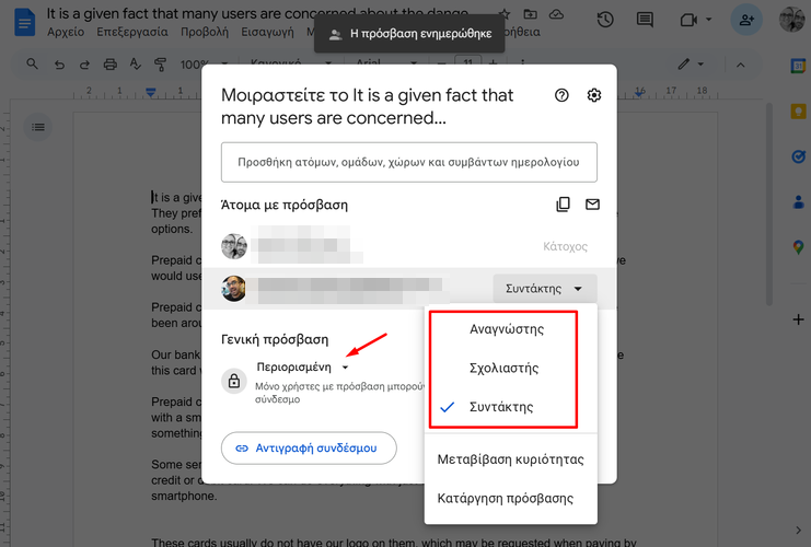 Στη συνέχεια, αν χρησιμοποιούμε απλό σύνδεσμο, ορίζουμε αν η πρόσβαση θα είναι “Περιορισμένη” ή όχι. Διαφορετικά, ορίζουμε το επίπεδο πρόσβασης για κάθε άτομο επιλέγοντας ανάμεσα σε “Αναγνώστης”, “Σχολιαστής”, ή “Συντάκτης”.