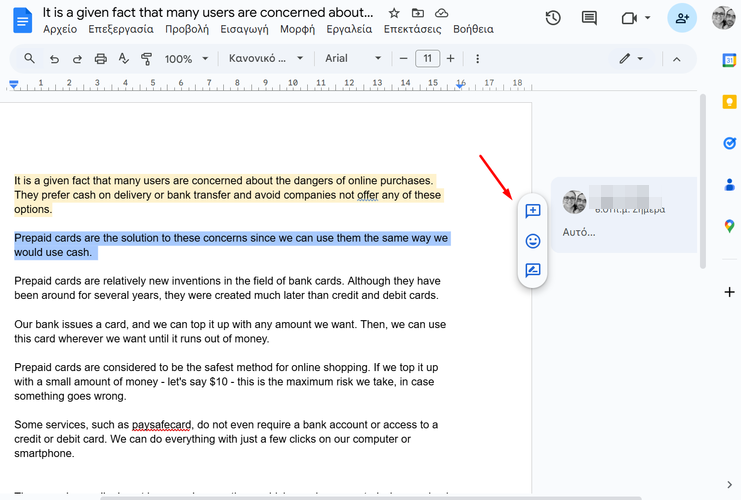 Για να χρησιμοποιήσουμε τα σχόλια, τα οποία λειτουργούν ως μεμονωμένα chat, επιλέγουμε κείμενο και πατάμε το εικονίδιο του σχολίου για να αφήσουμε παρατηρήσεις στους συνεργάτες μας.