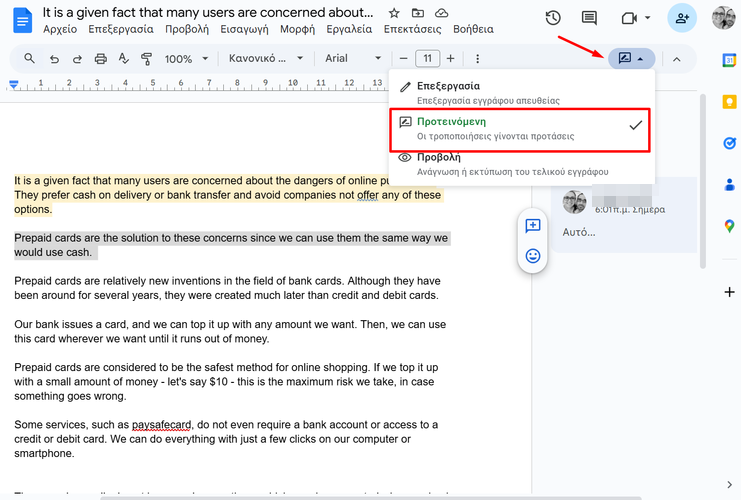 Τέλος, αν θέλουμε να προτείνουμε αλλαγές χωρίς να επηρεάσουμε άμεσα το κείμενο, διαλέγουμε τη λειτουργία “Προτεινόμενη”. Με αυτόν τον τρόπο, ό,τι αλλαγή κάνουμε δεν θα είναι οριστική και θα πρέπει να την εγκρίνει ο αρχικός κάτοχος του εγγράφου.