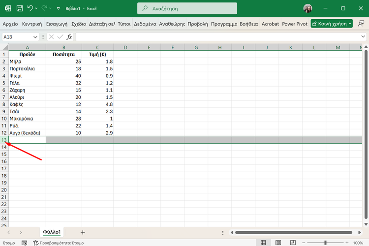 Αρχικά, επιλέγουμε την πρώτη κενή γραμμή κάτω από τα δεδομένα μας κάνοντας κλικ στον αριθμό της στα αριστερά.