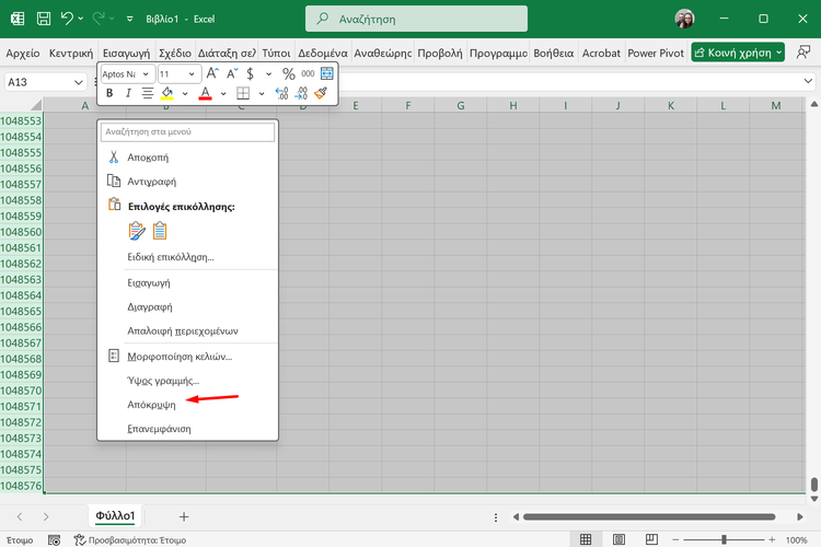 Τέλος, πατάμε “Ctrl + Shift + Δεξί Βέλος”, κάνουμε δεξί κλικ και επιλέγουμε πάλι “Απόκρυψη”.