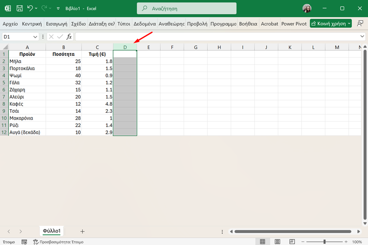 Μετά, επιλέγουμε την πρώτη κενή στήλη δεξιά από τα δεδομένα μας κάνοντας κλικ στο γράμμα της στο πάνω μέρος.