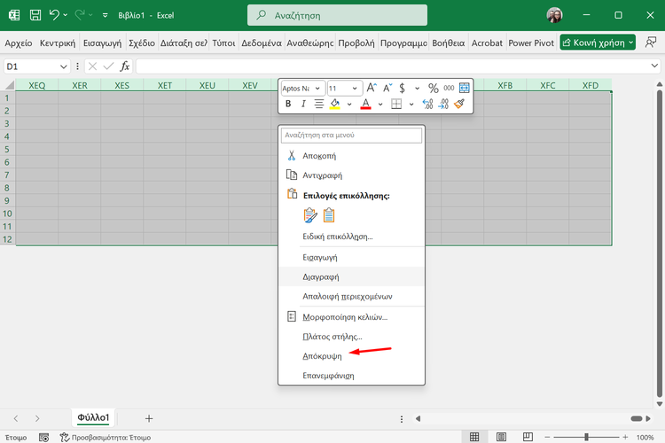 Στη συνέχεια, κάνουμε δεξί κλικ στην περιοχή που επιλέξαμε και πατάμε “Απόκρυψη”.