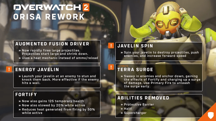 Η Blizzard έχει βελτιώσει τα γραφικά της Orisa και έχει προβεί σε διάφορες αλλαγές όσον αφορά τα χαρακτηριστικά της. Αρχικά, τα βλήματα της βασικής ικανότητας της έχουν μειούμενο μέγεθος και σταδιακά προκαλούν λιγότερη ζημιά.