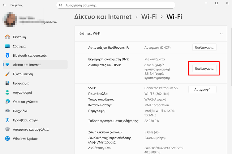 Μετά, στην ενότητα “Εκχώρηση διακομιστή DNS”, πατάμε το κουμπί “Επεξεργασία”.