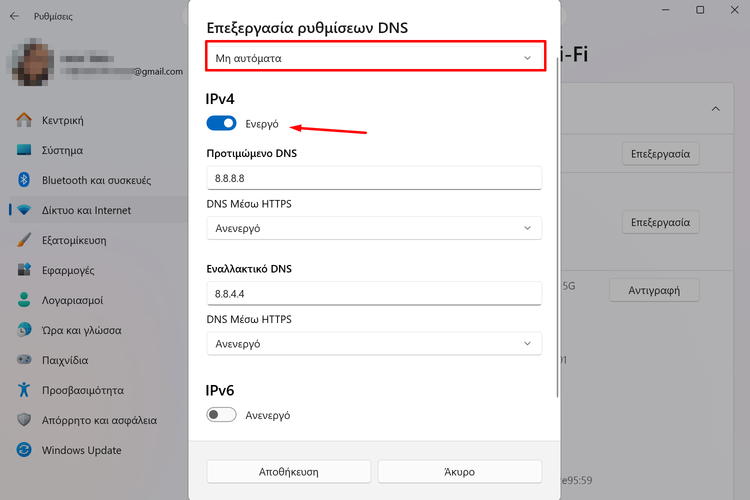 Στο πλαίσιο που θα ανοίξει, από το αναδυόμενο μενού επιλέγουμε “Μη αυτόματα” και ενεργοποιούμε τον διακόπτη για το “IPv4”.
