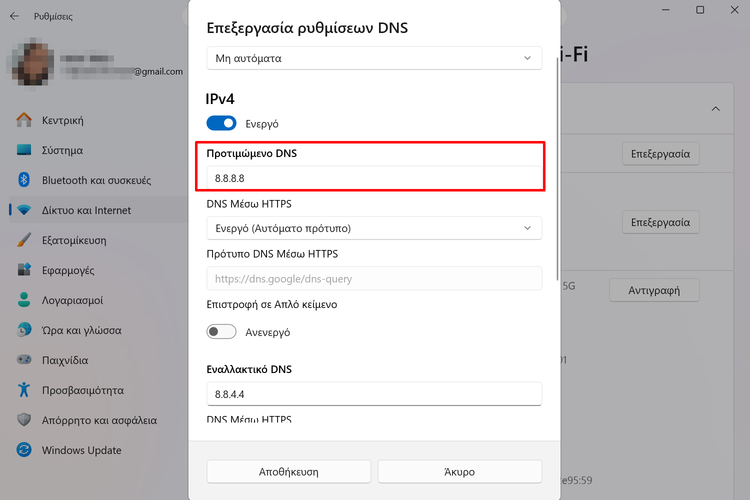Στη συνέχεια, στο πεδίο “Προτιμώμενο DNS” εισάγουμε “8.8.8.8” για να χρησιμοποιήσουμε τη Google ή “1.1.1.1” για να κάνουμε χρήση της Cloudflare.