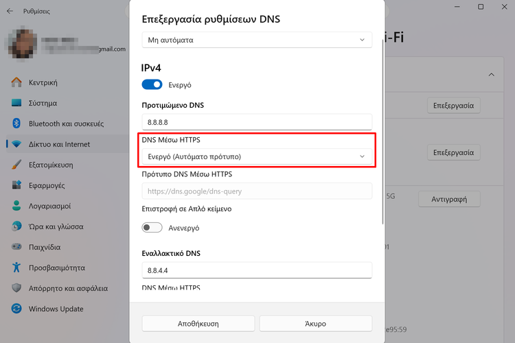 Έπειτα, στο αναδυόμενο μενού “DNS Μέσω HTTPS”, επιλέγουμε “Ενεργό (Αυτόματο πρότυπο)”.
