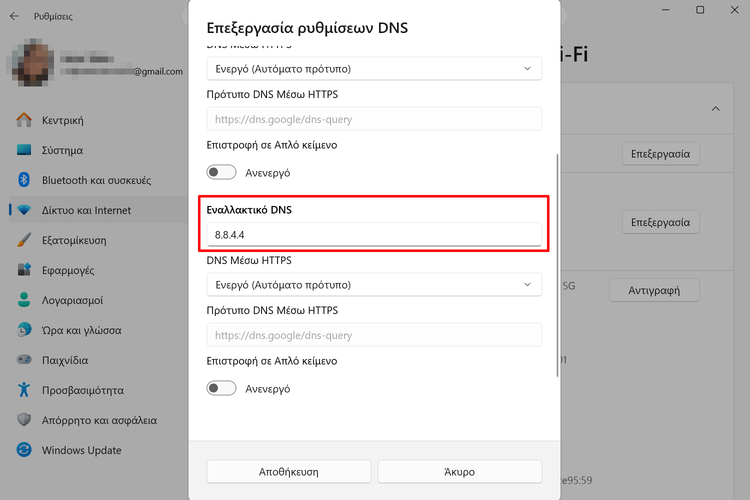 Μετά, στο πεδίο “Εναλλακτικό DNS” εισάγουμε “8.8.4.4” για τη Google ή “1.0.0.1” για την Cloudflare.