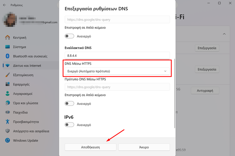Τέλος, στο μενού “DNS Μέσω HTTPS” επιλέγουμε πάλι “Ενεργό (Αυτόματο πρότυπο)” και πατάμε “Αποθήκευση”.