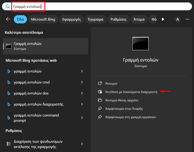 Αρχικά, ανοίγουμε το μενού Έναρξη, πληκτρολογούμε “Γραμμή εντολών” και επιλέγουμε “Εκτέλεση ως διαχειριστής”.