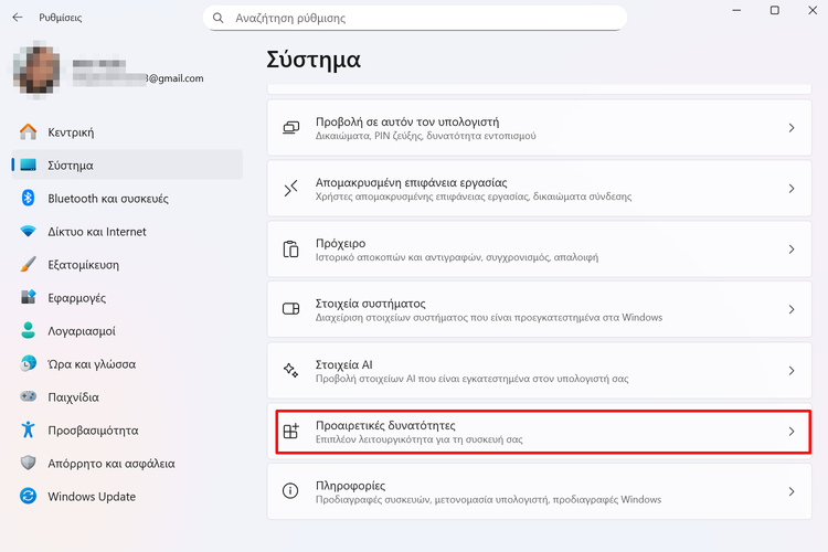 Στη συνέχεια, κάνουμε κλικ στην επιλογή “Προαιρετικές δυνατότητες”.