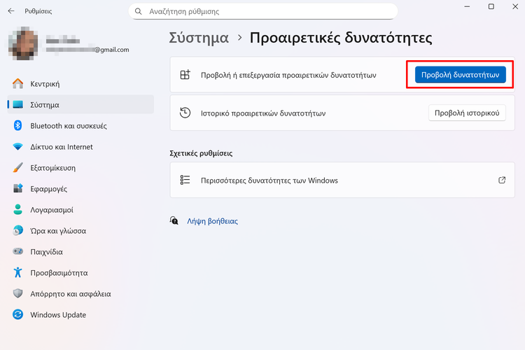 Για να προσθέσουμε μία νέα δυνατότητα, πατάμε το κουμπί “Προβολή δυνατοτήτων”.