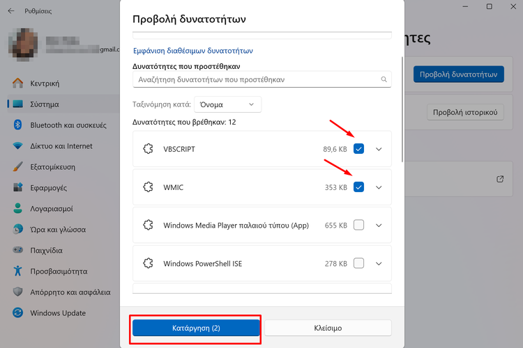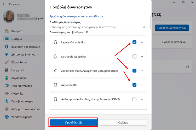 Έπειτα, επιλέγουμε από τη λίστα τα χαρακτηριστικά που θέλουμε να εγκαταστήσουμε και πατάμε “Προσθήκη”.