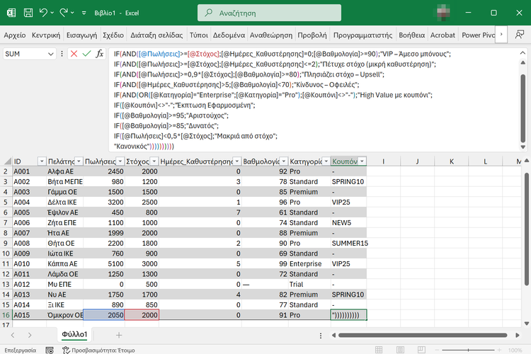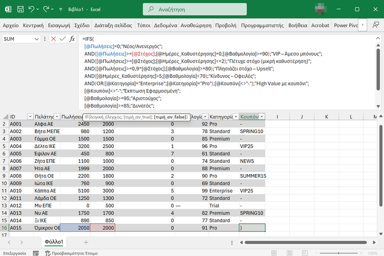 Αντί για ένθετες IF, χρησιμοποιούμε τη συνάρτηση IFS. Η σύνταξή της είναι =IFS(συνθήκη1, τιμή_αν_αληθής1, συνθήκη2, τιμή_αν_αληθής2, …). Αυτό μετατρέπει έναν πολύπλοκο τύπο σε μια απλή λίστα ελέγχου.