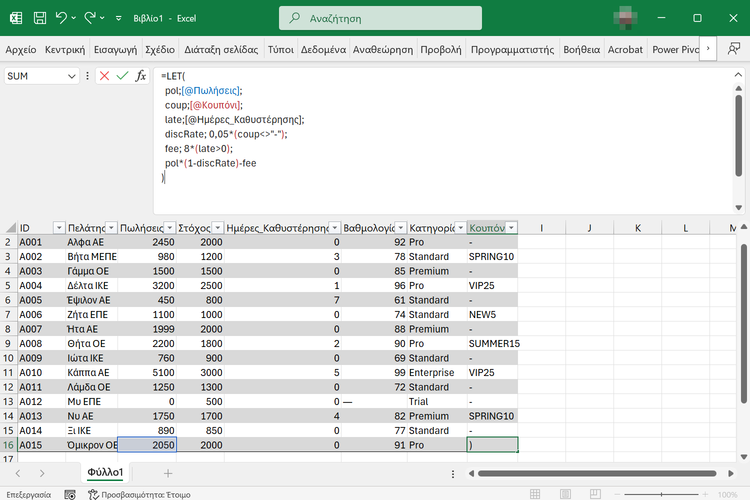 Για ακόμα πιο καθαρούς τύπους, αξιοποιούμε τη συνάρτηση LET. Η LET επιτρέπει να ορίσουμε ένα όνομα για έναν υπολογισμό και να το επαναχρησιμοποιήσουμε.
