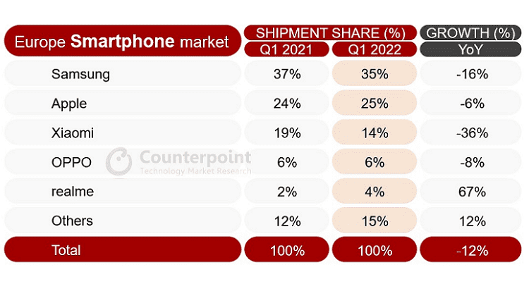 Η realme, η ταχύτερα αναπτυσσόμενη μάρκα smartphone για το 2021 και ανάμεσα στις 4 κορυφαίες επωνυμίες smartphone στην Ευρώπη, έδειξε μεγάλη ανθεκτικότητα όσον αφορά την απόδοσή της το πρώτο τρίμηνο, παραμένοντας η μόνη μάρκα smartphone ανάμεσα στις 5 κορυφαίες που κατέγραψε ετήσια αύξηση αποστολών μέσα στο 1ο τρίμηνο του 2022 στην Ευρώπη, σύμφωνα με την Counterpoint.