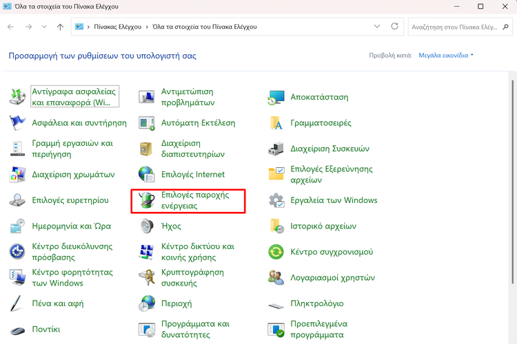 Μετά, διαλέγουμε το “Επιλογές παροχής ενέργειας”.