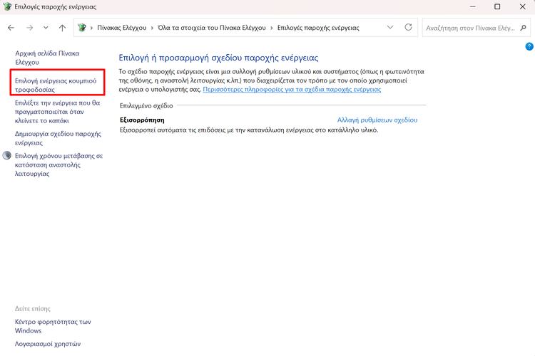 Έπειτα, κάνουμε κλικ στο “Επιλογή ενέργειας κουμπιού τροφοδοσίας”.
