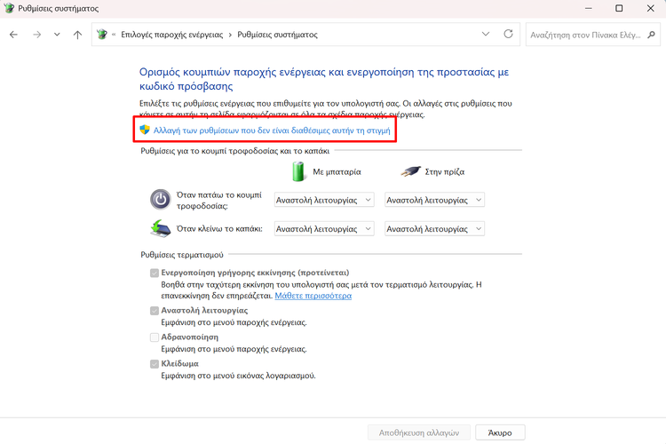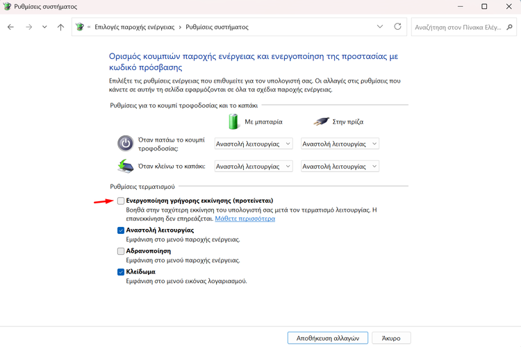 Μετά, στην ενότητα “Ρυθμίσεις τερματισμού”, αποεπιλέγουμε το “Ενεργοποίηση γρήγορης εκκίνησης (προτείνεται)”.