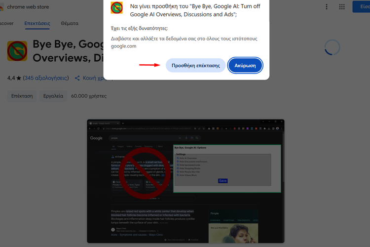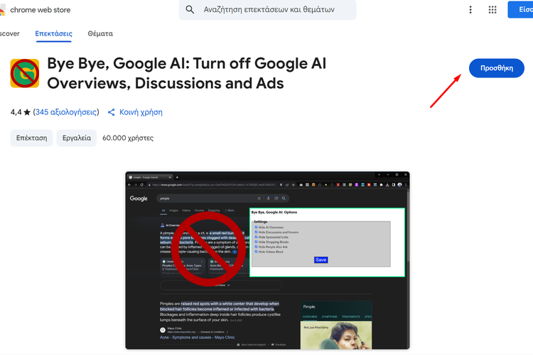 Μόλις ολοκληρωθεί η εγκατάσταση της επέκτασης, κάνουμε επανεκκίνηση του browser και τα AI Overviews θα έχουν εξαφανιστεί από την αναζήτηση της Google.