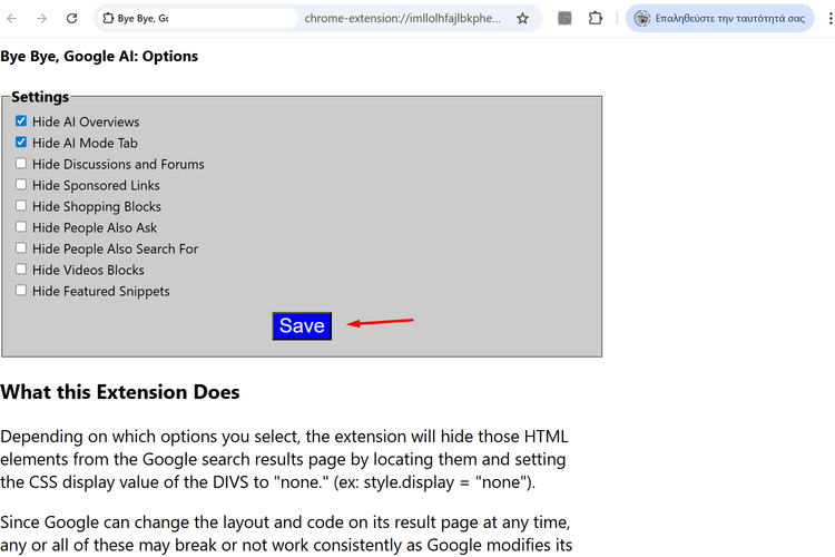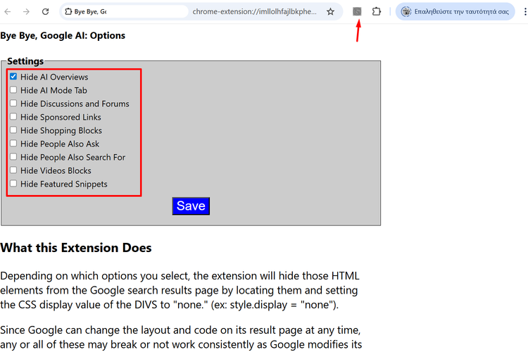 Επιπλέον, κάνοντας κλικ στο κουμπί της επέκτασης, μπορούμε να επιλέξουμε να απενεργοποιήσουμε και άλλες λειτουργίες ιστοσελίδων, όπως το “AI Tab” του Google Search.