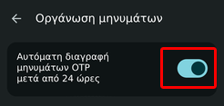 Τέλος, ενεργοποιούμε τον διακόπτη δίπλα στο “Αυτόματη διαγραφή μηνυμάτων OTP μετά από 24 ώρες”.