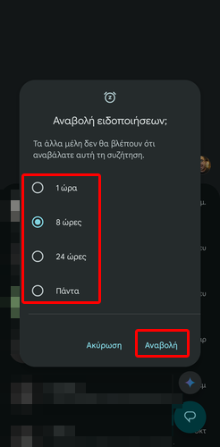 Στο πλαίσιο που θα εμφανιστεί, επιλέγουμε τη διάρκεια της σίγασης και πατάμε το κουμπί “Αναβολή”.