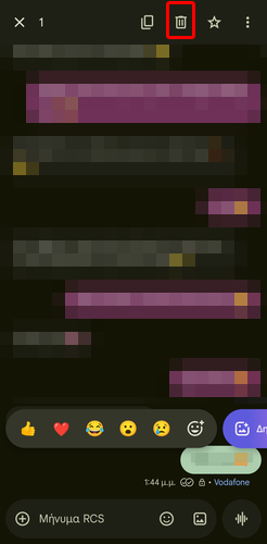 Όσον αφορά τη διαγραφή μηνυμάτων, πατάμε παρατεταμένα στο μήνυμα που θέλουμε να διαγράψουμε και πατάμε το εικονίδιο του κάδου ανακύκλωσης.