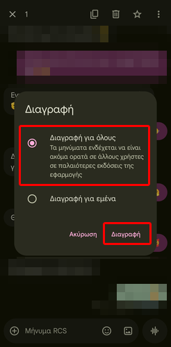 Μετά, επιλέγουμε “Διαγραφή για όλους” και πατάμε το κουμπί “Διαγραφή”.