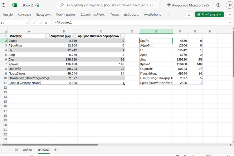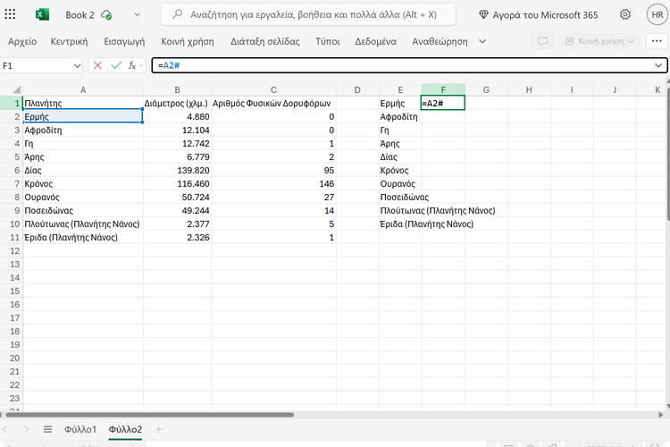 Πλέον, μπορούμε να χρησιμοποιήσουμε το σύμβολο # σε συναρτήσεις για να αναφερθούμε σε ολόκληρο το δυναμικό εύρος. Για παράδειγμα, με τη “=SORT(E2#;2;1)” εμείς ταξινομήσαμε όλους τους πλανήτες του πίνακα με βάση τη διάμετρο τους, από τον μικρότερο στον μεγαλύτερο.