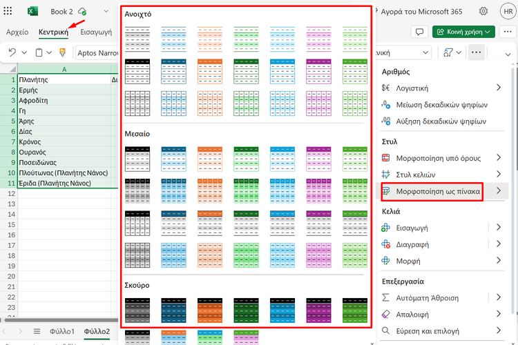 Αρχικά, επιλέγουμε τα δεδομένα, από την “Κεντρική” καρτέλα πατάμε “Μορφοποίηση ως πίνακας”, και διαλέγουμε το θέμα της αρεσκείας μας.