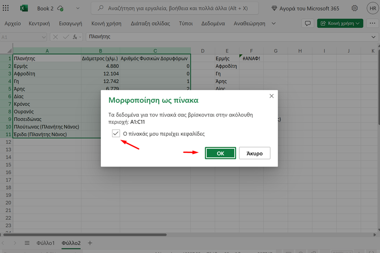 Στο πλαίσιο που θα ανοίξει, διαλέγουμε το κουτάκι δίπλα στο “Ο πίνακάς μου περιέχει κεφαλίδες” και πατάμε “OK”.