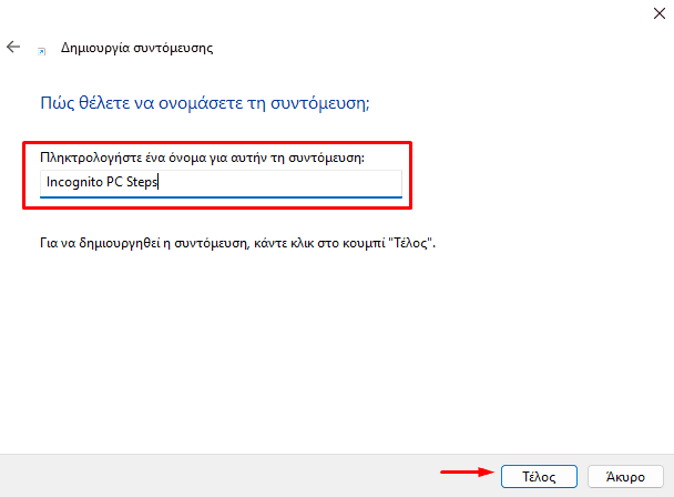 Στη συνέχεια, γράφουμε το όνομα το οποίο επιθυμούμε να έχει η συντόμευση και κάνουμε κλικ στο “Τέλος”.