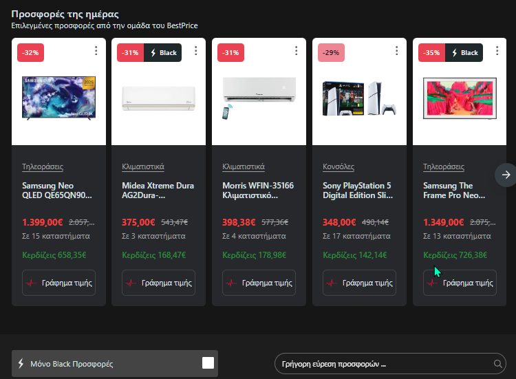 Το BestPrice.gr, η Νο1 πλατφόρμα σύγκρισης τιμών στην Ελλάδα, μπορεί να μας βοηθήσει να ανακαλύψουμε την πραγματικά καλύτερη τιμή για την Black Friday, όπως και τις υπόλοιπες μέρες του χρόνου.