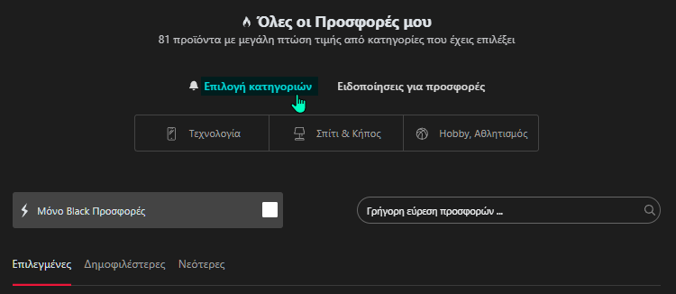 Θα ήταν πολύ βολικό να μπορούσε να μας ενημερώσει κάποιο εργαλείο, όταν και αν αυτό το μοντέλο βγει σε προσφορά. Και αυτό ακριβώς κάνει η κατηγορία Οι προσφορές μου. Η οποία λειτουργεί είτε για μεμονωμένα προϊόντα, είτε για ολόκληρες κατηγορίες προϊόντων.
