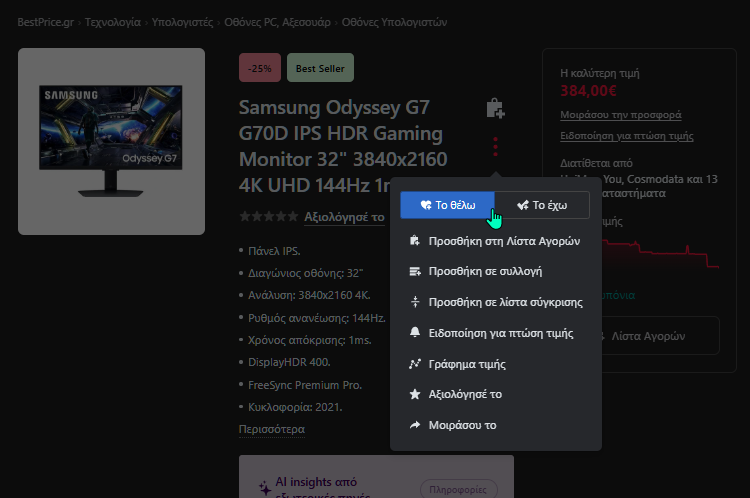 Ας πούμε ότι θέλουμε να πάρουμε την Samsung Odyssey G7. Θα τη βάλουμε στη λίστα με τα προϊόντα που θέλουμε, πατώντας το κουμπί “Το θέλω” με την καρδούλα.