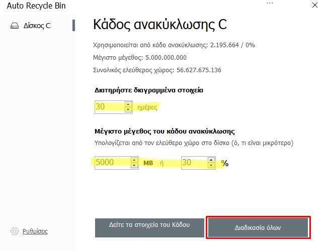 Τέλος, από τις “Ρυθμίσεις” μπορούμε να επιλέξουμε αν το Auto Recycle Bin θα διαγράφει αυτόματα αρχεία κατά την έναρξη των Windows ή αν θα εκτελούμε αυτή την εργασία χειροκίνητα πατώντας το κουμπί “Διαδικασία όλων”.