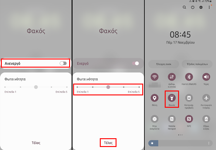 Θα εμφανιστεί ο διακόπτης ενεργοποίησης και η μπάρα ρύθμισης της φωτεινότητας του φακού. Ενεργοποιούμε τον διακόπτη, επιλέγουμε το επιθυμητό επίπεδο, πατάμε “Τέλος”, και απενεργοποιούμε τον διακόπτη για να κλείσουμε τον φακό.