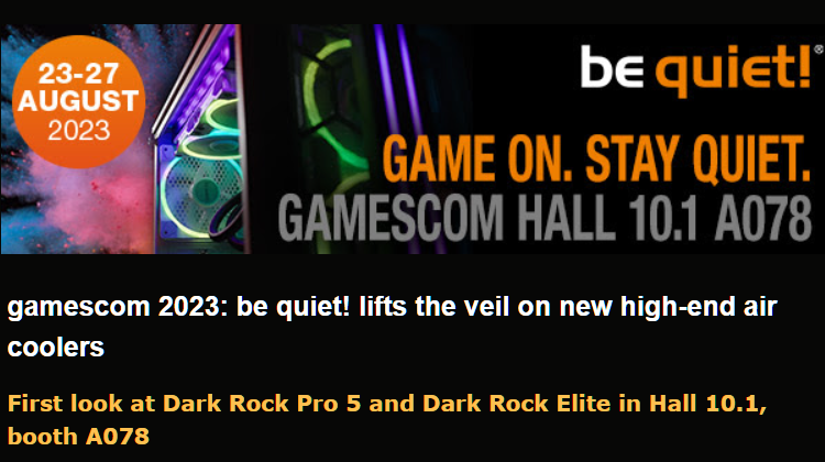 Glinde, August 23, 2023 – be quiet!, the German manufacturer for premium PC components, is unveiling two brand-new high-end air coolers at the gamescom expo in Cologne, Germany, from August 23rd to 27th. Dark Rock Pro 5 follows in the footsteps of the extremely successful and award-winning Dark Rock Pro 4, offering immense cooling performance at low noise levels on all popular consumer platforms, while Dark Rock Elite is aimed at users that require the highest performance and airflow, integrating ARGB lighting and a unique front fan rail system for an elite experience.