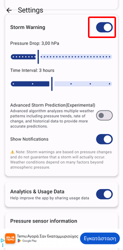 Επιπλέον, από τις ρυθμίσεις της εφαρμογής μπορούμε να ενεργοποιήσουμε τις ειδοποιήσεις για καταιγίδες, ώστε το κινητό να μας προειδοποιεί σε περίπτωση απότομης πτώσης της πίεσης. Για να κάνουμε κάτι τέτοιο, ενεργοποιούμε τον διακόπτη δίπλα στο “Storm Warning”.
