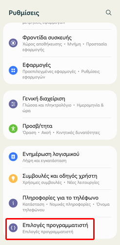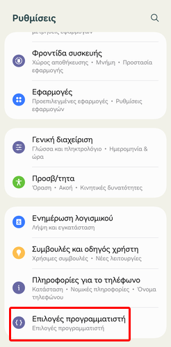 Αρχικά, βεβαιωνόμαστε ότι έχουμε ενεργοποιήσει τις Επιλογές προγραμματιστή στις ρυθμίσεις του Android και μπαίνουμε στο σχετικό μενού.