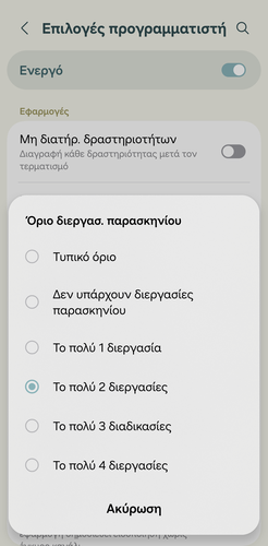 Αν αισθανόμαστε ότι το κινητό μας “κολλάει”, μπορούμε να περιορίσουμε το πόσες διεργασίες επιτρέπεται να εκτελούνται παράλληλα στο παρασκήνιο. Με αυτόν τον τρόπο, το σύστημα αναγκάζεται να κλείνει πιο γρήγορα τις εφαρμογές που δεν χρησιμοποιούμε εκείνη τη στιγμή, απελευθερώνοντας πολύτιμους πόρους για την εφαρμογή που έχουμε ανοιχτή.
