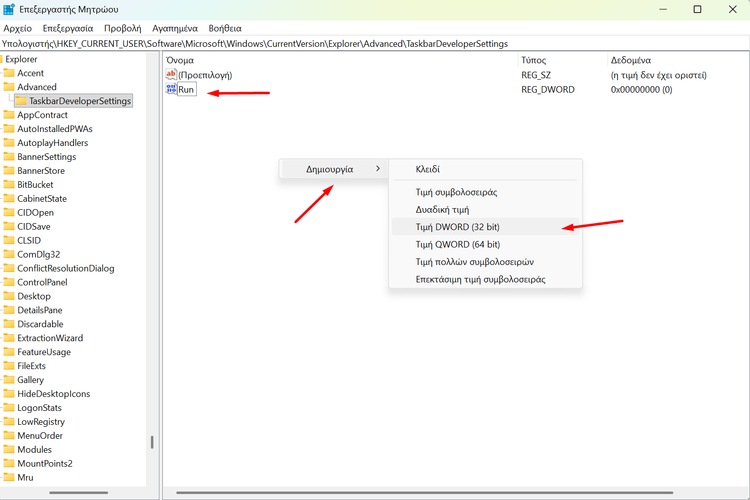 Έπειτα, κάνουμε δεξί κλικ στον κενό χώρο, επιλέγουμε “Δημιουργία → Τιμή DWORD (32-bit)”, και ονομάζουμε τη νέα τιμή “Run”.