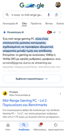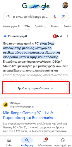 Στην κορυφή των αποτελεσμάτων αναζήτησης θα εμφανιστεί η ενότητα AI Overview. Ακριβώς από κάτω, υπάρχει η επιλογή “Εμφάνιση περισσότερων”, την οποία και πατάμε.