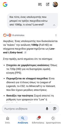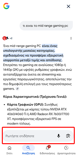 Στο πλαίσιο που βρίσκεται στο κάτω μέρος της οθόνης, μπορούμε να πληκτρολογήσουμε ερωτήσεις, να ζητήσουμε διευκρινίσεις, και τα λοιπά. Η AI της Google θα ανταποκριθεί δίνοντας μας επιπλέον πληροφορίες, λαμβάνοντας υπόψη την αρχική αναζήτηση που είχαμε κάνει.