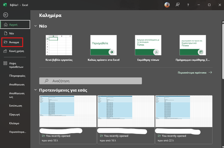 Αρχικά, ανοίγουμε το Excel και πηγαίνουμε στο μενού “Αρχείο” και πατάμε “Άνοιγμα”.