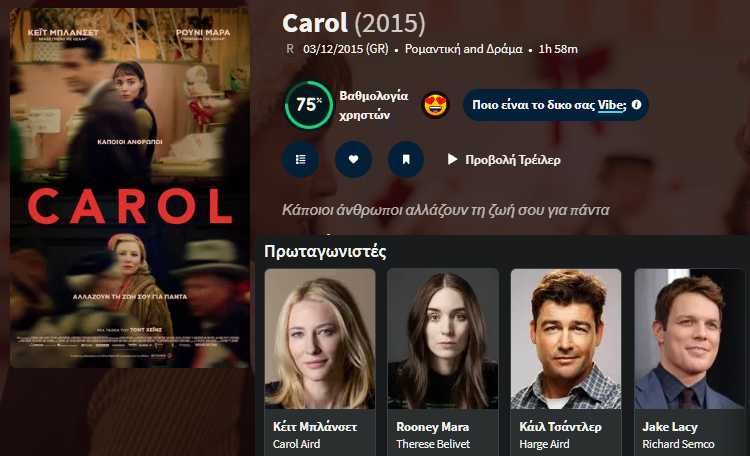 Παρότι η Carol είναι χριστουγεννιάτικη στη διάθεση και στο χρόνο, χρησιμοποιεί το εορταστικό πλαίσιο αλλιώς. Για να φωτίσει τα συναισθηματικά βάρη, τις κοινωνικές πιέσεις, το πάθος, και τον απαγορευμένο έρωτα, δημιουργώντας μια μελαγχολική, αλλά ωραία εσωτερική ατμόσφαιρα. Και φυσικά, ξεχωρίζει η εξαιρετική ερμηνεία της Cate Blanchett.